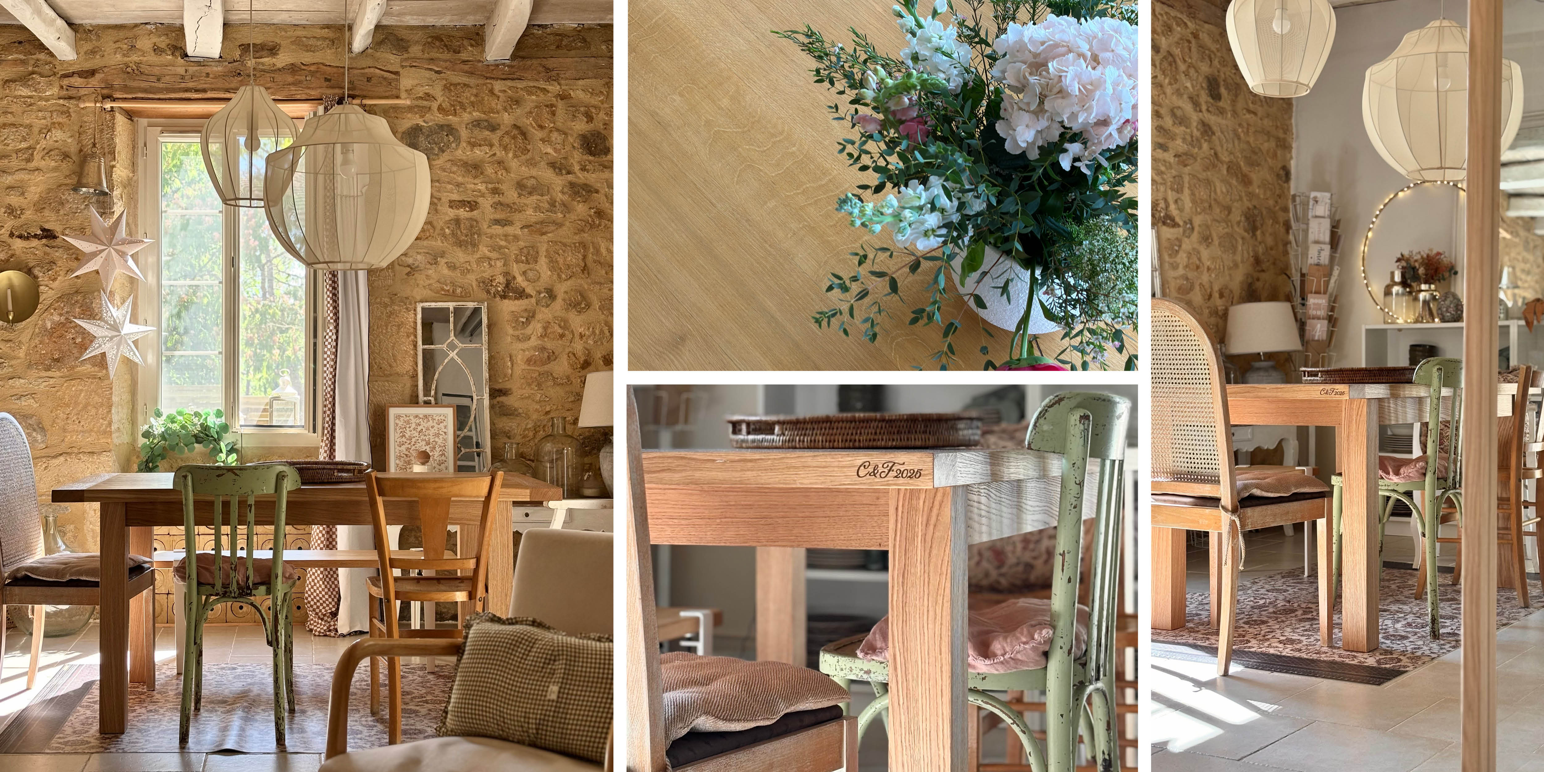 Tout commence par une rencontre. Virginie, notre cliente, plus connue sous le nom de "Viens on rénove" sur Instagram, souhaitait une table à son image : élégante, chaleureuse et fonctionnelle pour accueillir toute sa famille. Lors d’un rendez-vous personnalisé, elle a échangé ses idées avec un concepteur : les dimensions idéales pour son espace, le style recherché (pied central, lignes épurées, finition naturelle…), la personnalisation et les usages au quotidien.