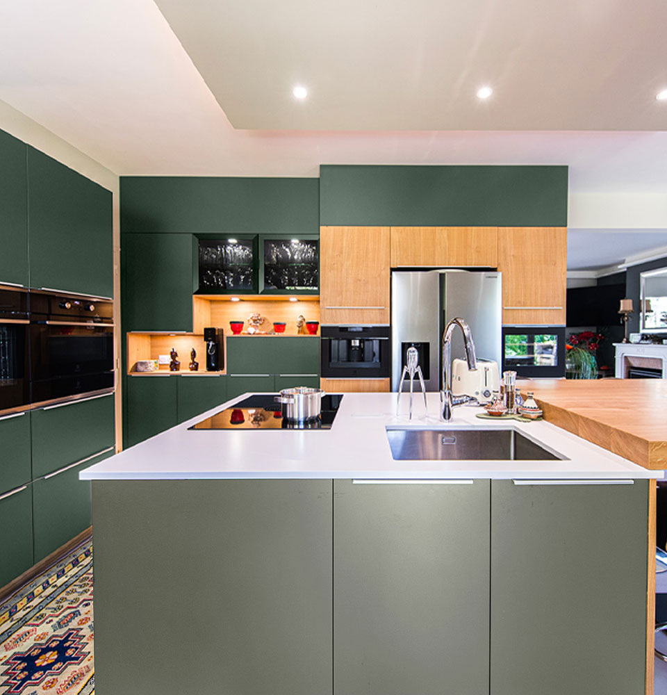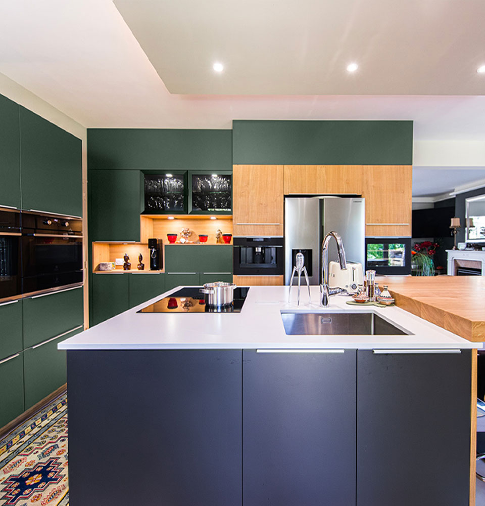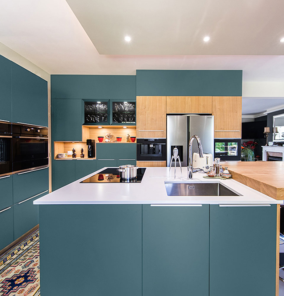 Dans une cuisine colorée, le choix des teintes et des matériaux s'avère primordial. Nos cuisinistes vous offrent une large palette de couleurs et de finitions pour un résultat à l’image de vos désirs. Grâce à nos partenaires, nous pouvons vous proposer des surfaces innovantes pour vos plans de travail et crédences. Votre cuisine colorée pourra accueillir le plan de travail en quartz vert veiné ou la crédence verte effet béton de vos rêves !
