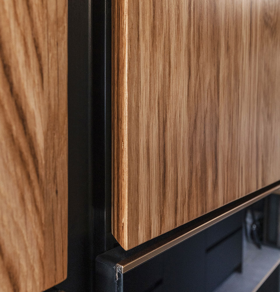 La fabrication de ce modèle exclusif repose sur un véritable travail de marqueterie. Seul l’œil aguerrit de nos ébénistes est capable de sélectionner rigoureusement chaque lame de bois et de les assembler afin d’obtenir des lignes uniques pour chaque client.