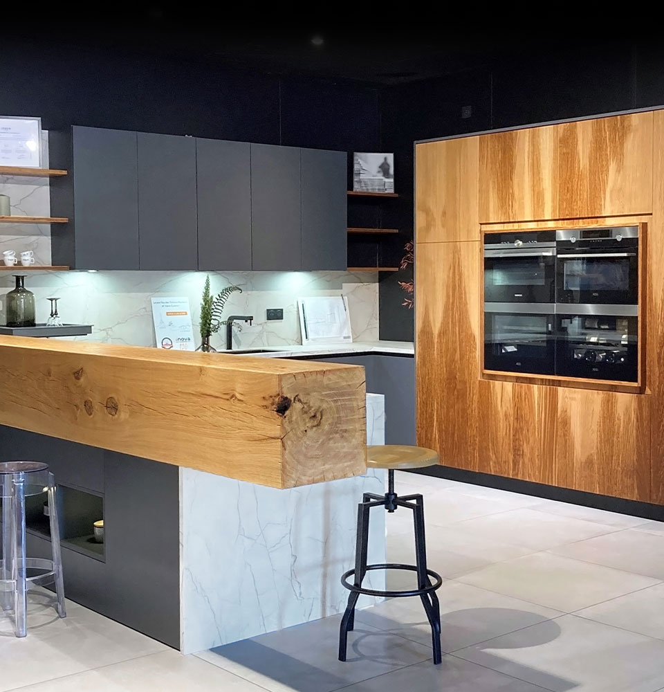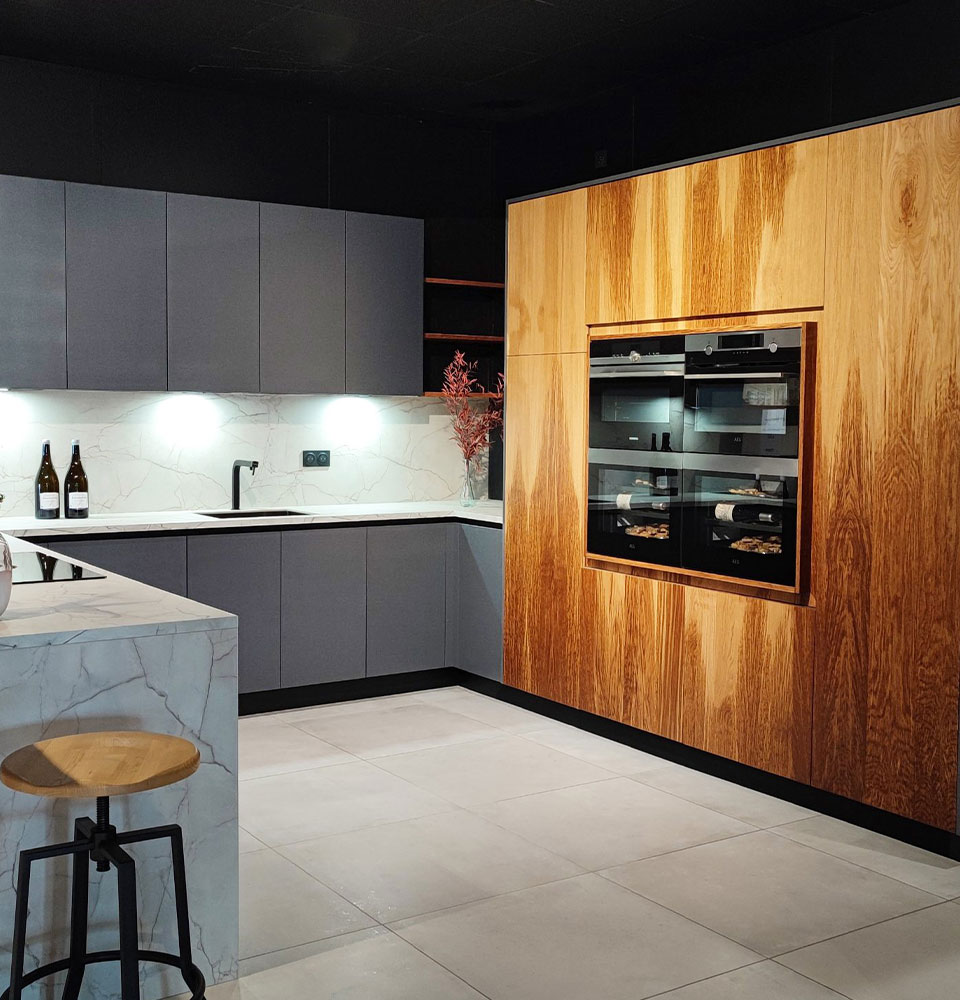Misez sur une association de matières naturelles pour conserver l’esprit authentique de ce modèle. Optez pour un plan de travail en Dekton noir marbré qui traversera les années sans se démoder.