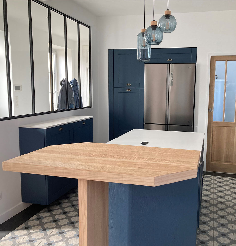 Pour un esprit traditionnel optez pour un vernis brut et un plan de travail en pierre.