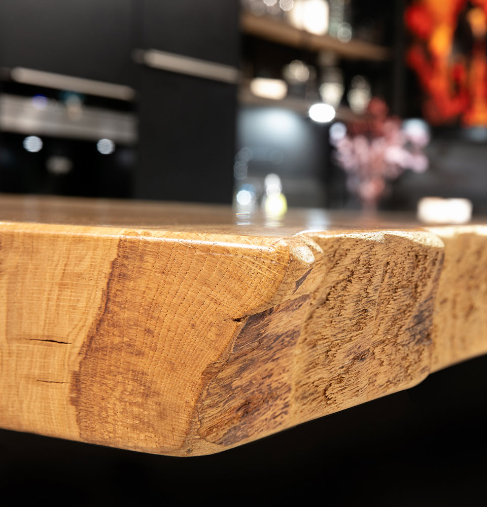 Vous souhaitez en plan de travail authentique ? Optez pour le plan en chêne massif avec écorce en 45mm ou 75mm d’épaisseur. Chaque pièce est unique est fabriquée sur-mesure selon vos besoins avec des renforts métalliques pour une durabilité optimale.