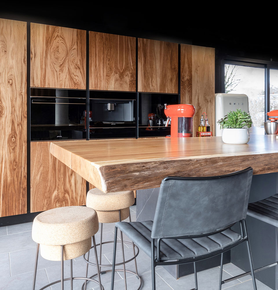 Le bois est un véritable intemporel qui offre l’avantage de s’associer avec tout type de couleurs et de matériaux. Dans un souci d’entretien au quotidien, nous vous recommandons de l’associer avec un plan de travail en pierre autour de votre évier. Le bois se mariera parfaitement avec un plan de travail en granit ou un Dekton effet marbre.