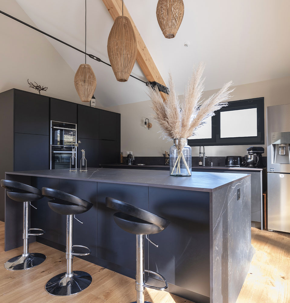 Vous préférez une cuisine au style industriel ? Privilégiez un plan de travail noir texturé ou aspect béton qui apportera du cachet à votre cuisine.