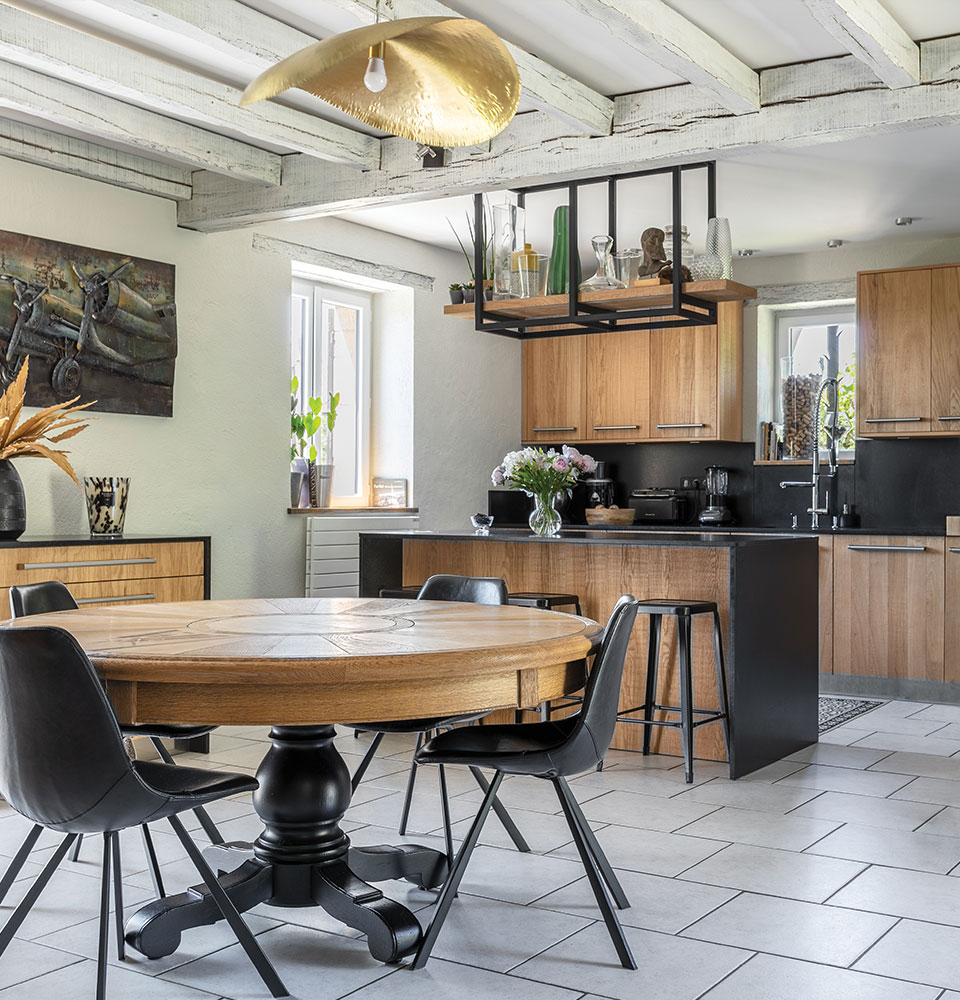 Posez des luminaires XXL en métal, des tabourets de style rétro ou une grosse horloge, et vous obtiendrez un espace cosy dans l’esprit atelier. Les pièces chinées apportent toujours un peu de personnalité à vos espaces.