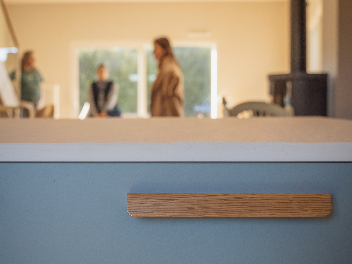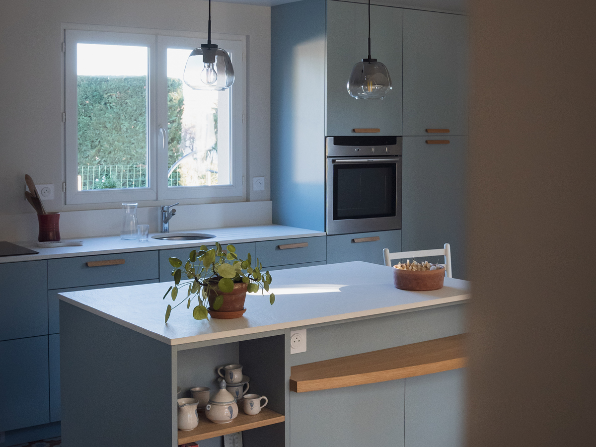 Cap sur Montbrison pour découvrir une cuisine aux tonalités douces, mêlant bleu poudré et bois, réalisée par Inova Cuisine Montbrison.
