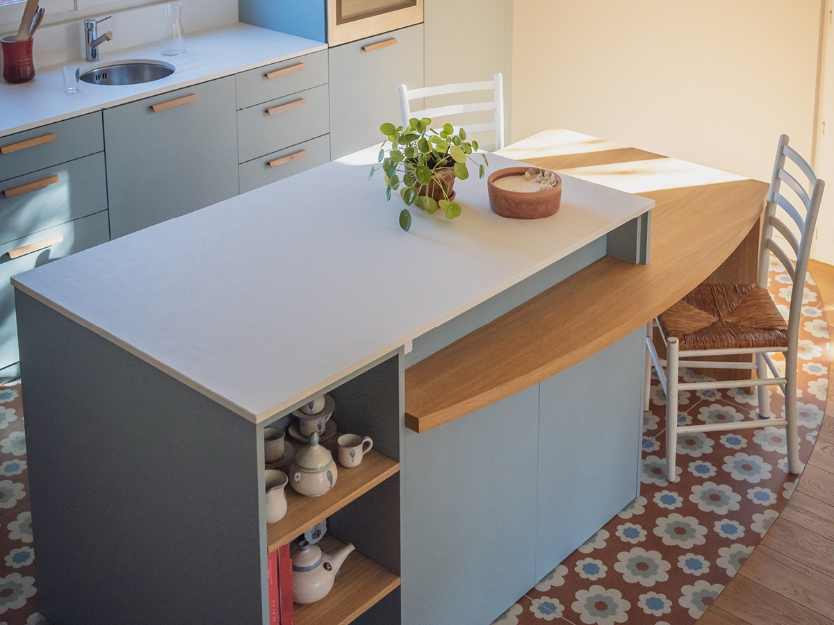L'îlot central se compose d’un plan de travail Ardesia Blanco, doux et clair, et d’un coin repas en chêne, conçu dans nos ateliers avec un élégant effet arrondi qui s’harmonise avec le sol.