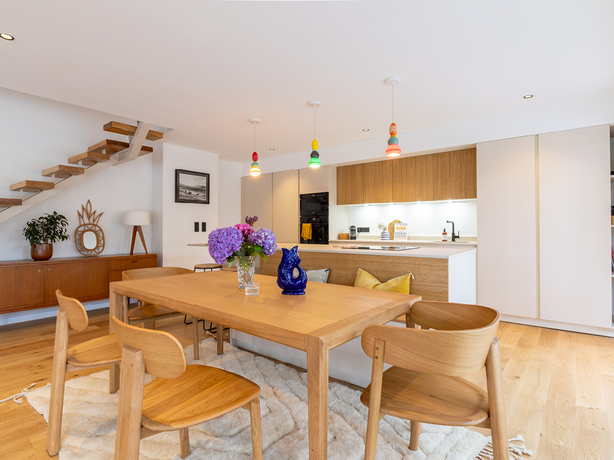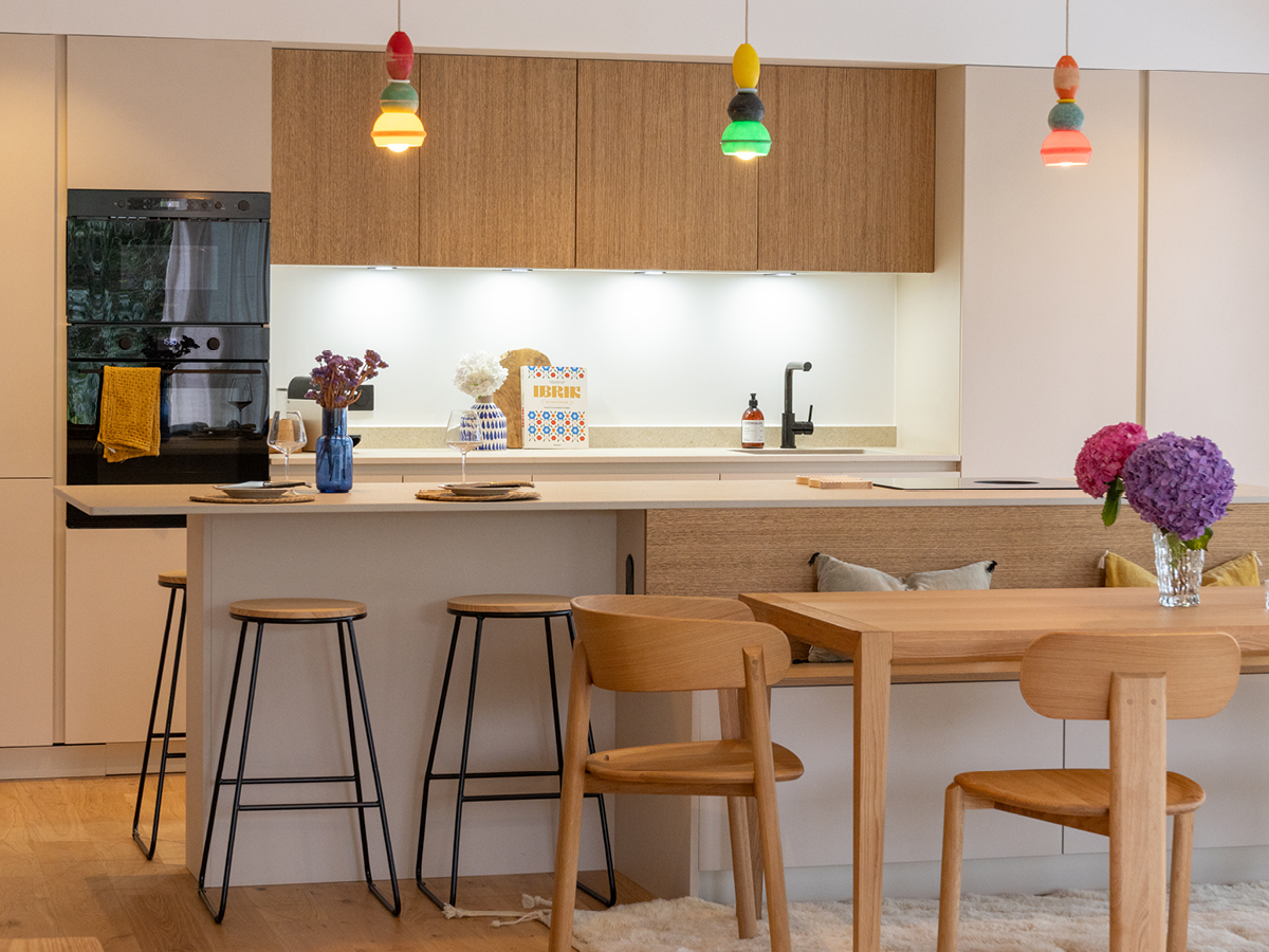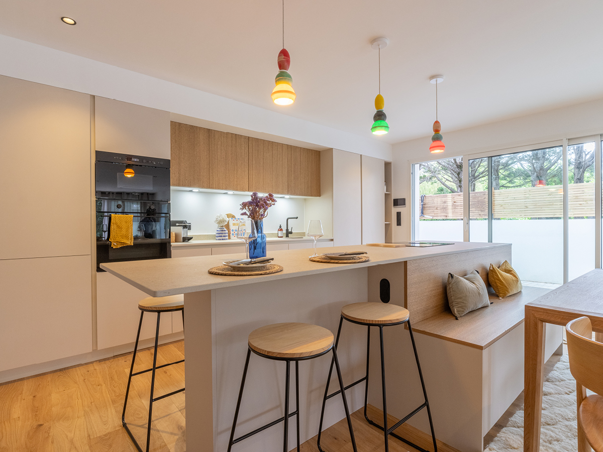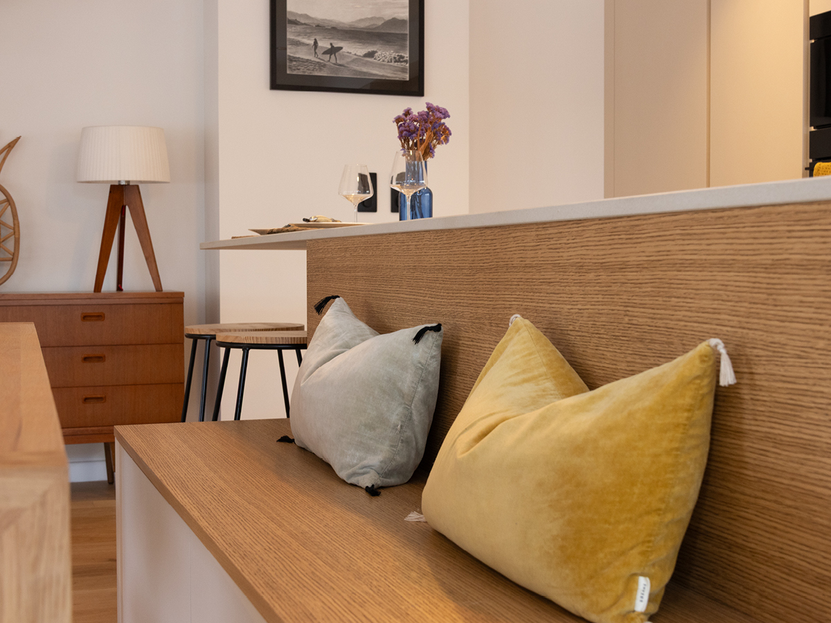Une banquette prolonge l’espace en coin repas, complété par des tabourets hauts pour un coin snack convivial.