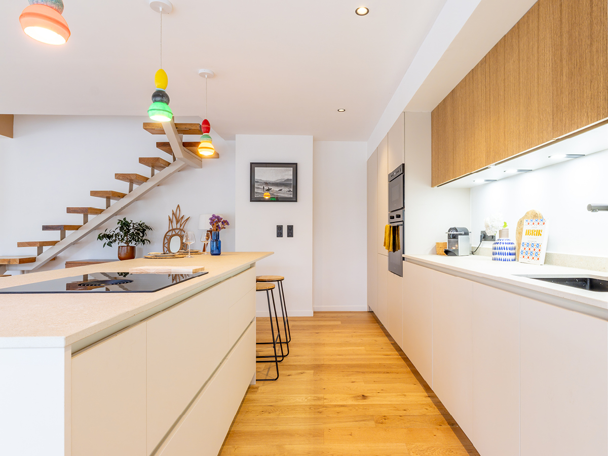 Le plan de travail en Dekton Avorio apporte une touche minérale et lumineuse, tandis que les poignées coloris sur mesure soulignent le caractère unique de la pièce.