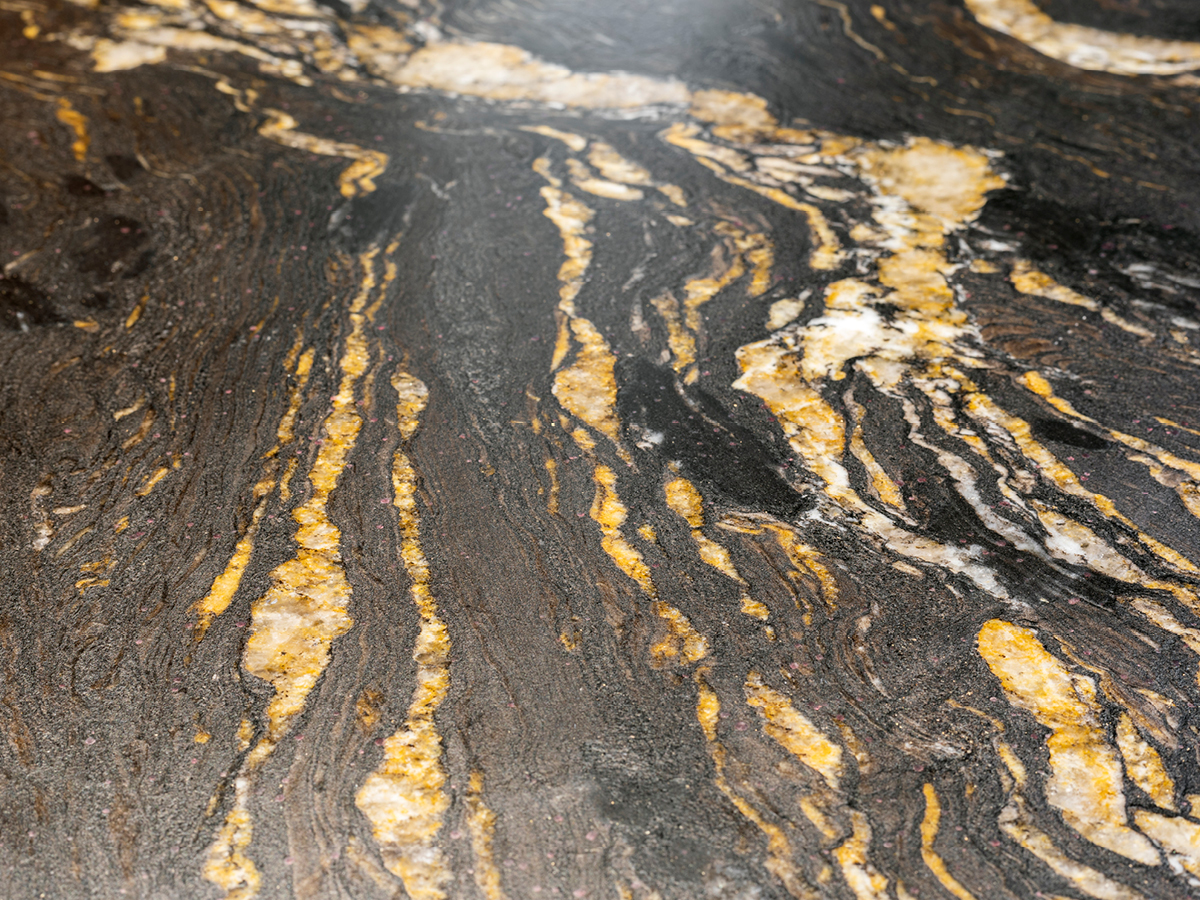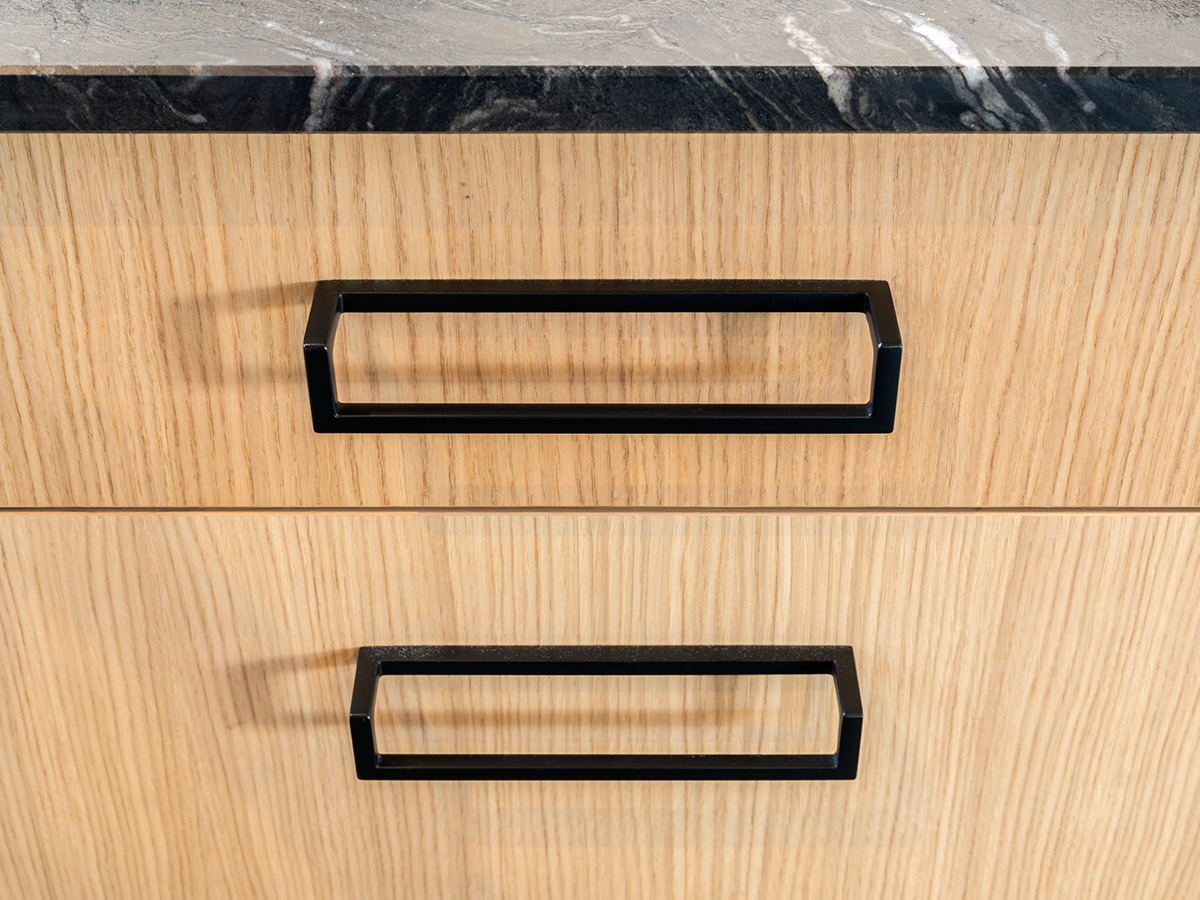 Le choix s’est porté sur le modèle bois Bourbon brut, dont les nuances profondes et la texture authentique apportent une chaleur naturelle à la pièce. En parfaite complémentarité, le plan de travail en granit Cheyenne Vintage vient renforcer le caractère unique de cette réalisation, un matériau noble et texturé, aussi esthétique que résistant.