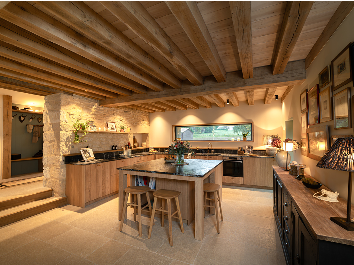 L’îlot central allie fonctionnalité et convivialité, avec de généreux rangements et un espace pensé pour accueillir des tabourets discrètement rangés.