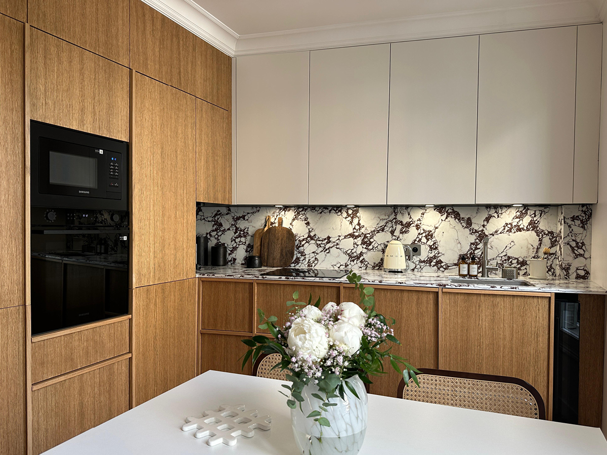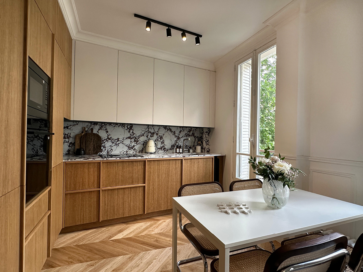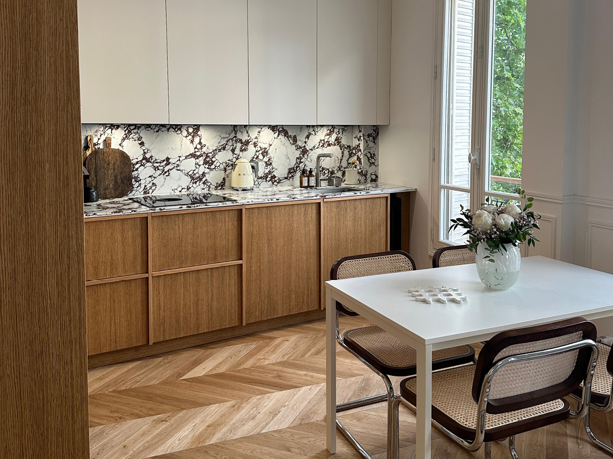 Au cœur du centre-ville de Tours, cet appartement abrite une cuisine équipée intemporelle pensée pour s’intégrer avec sobriété et élégance au quotidien de nos clients.