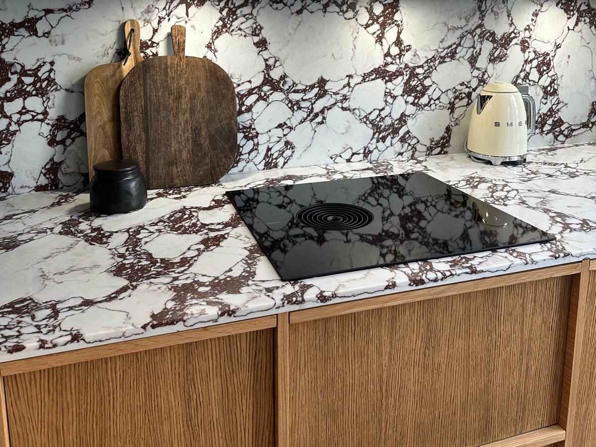 Le plan de travail Calacatta Viola, au style néoclassique, imite fidèlement les veines du marbre et apporte brillance et profondeur.