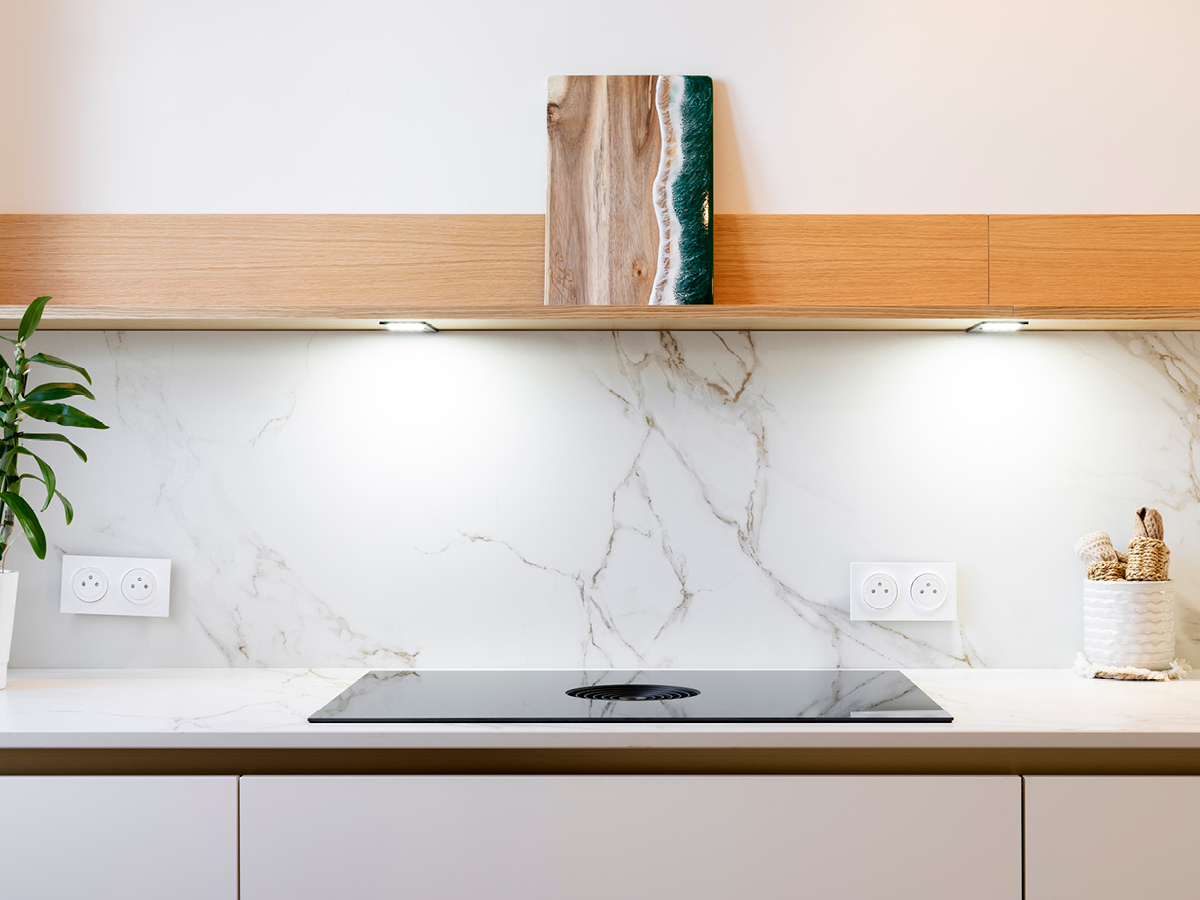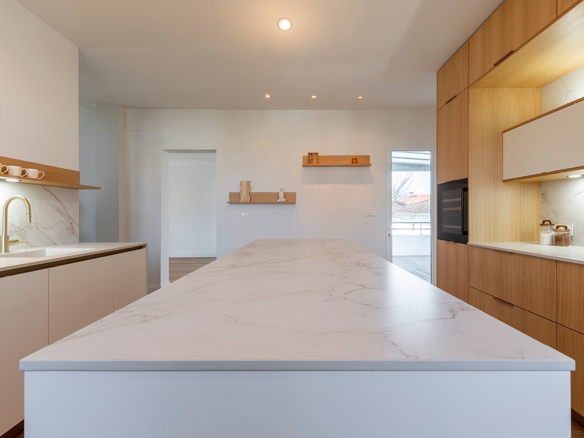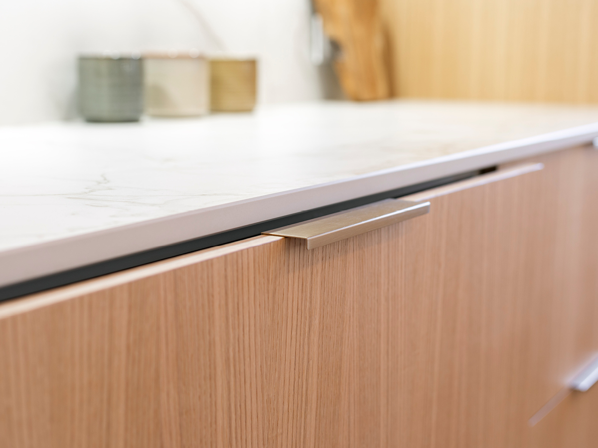 Nos clients ont opté pour l’alliance de deux matériaux : le modèle en bois Bourbon et sa finition huilée et la laque Iso en teinte Lin, apportant chaleur et élégance à leur foyer. Le plan en Dekton Entzo, robuste et moderne, assure quant à lui la luminosité attendue dans la pièce.