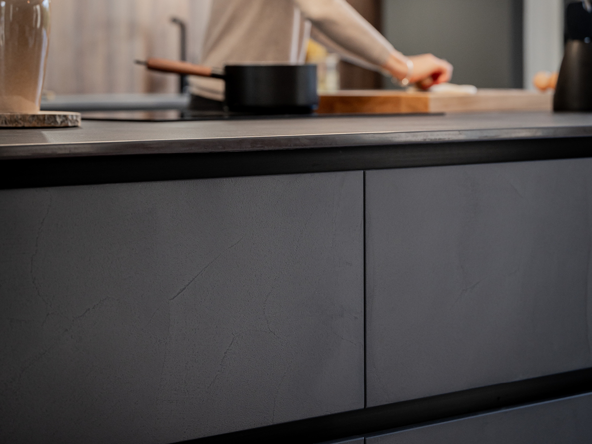 Le plan de travail Dekton Kelya, avec son veinage marbré, s’inscrit avec élégance dans la continuité de la cuisine, répondant parfaitement à l’harmonie souhaitée. Entre esthétisme et performance, il incarne l’équilibre recherché par notre cliente.