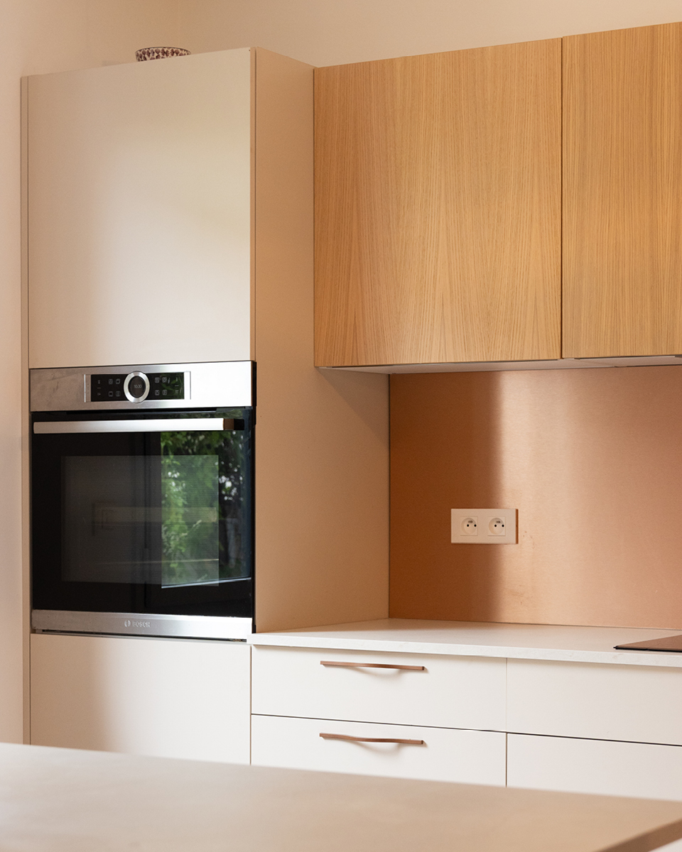 Nos clients ont été séduits par un plan de travail Marfil Cream, à la fois lumineux et fonctionnel, ainsi que par une crédence Brushed Copper aux reflets cuivrés.