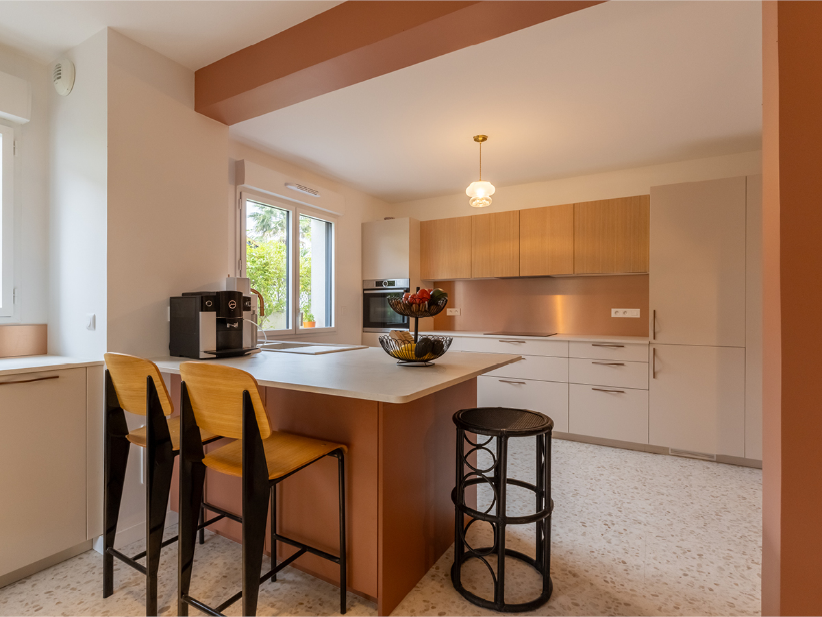 Véronique et Guy souhaitaient une cuisine pensée autour de leur sol imitation Terrazzo, un revêtement italien emblématique composé de fragments de pierre.